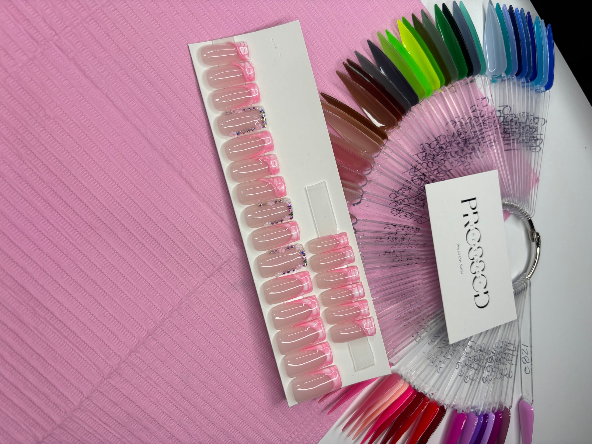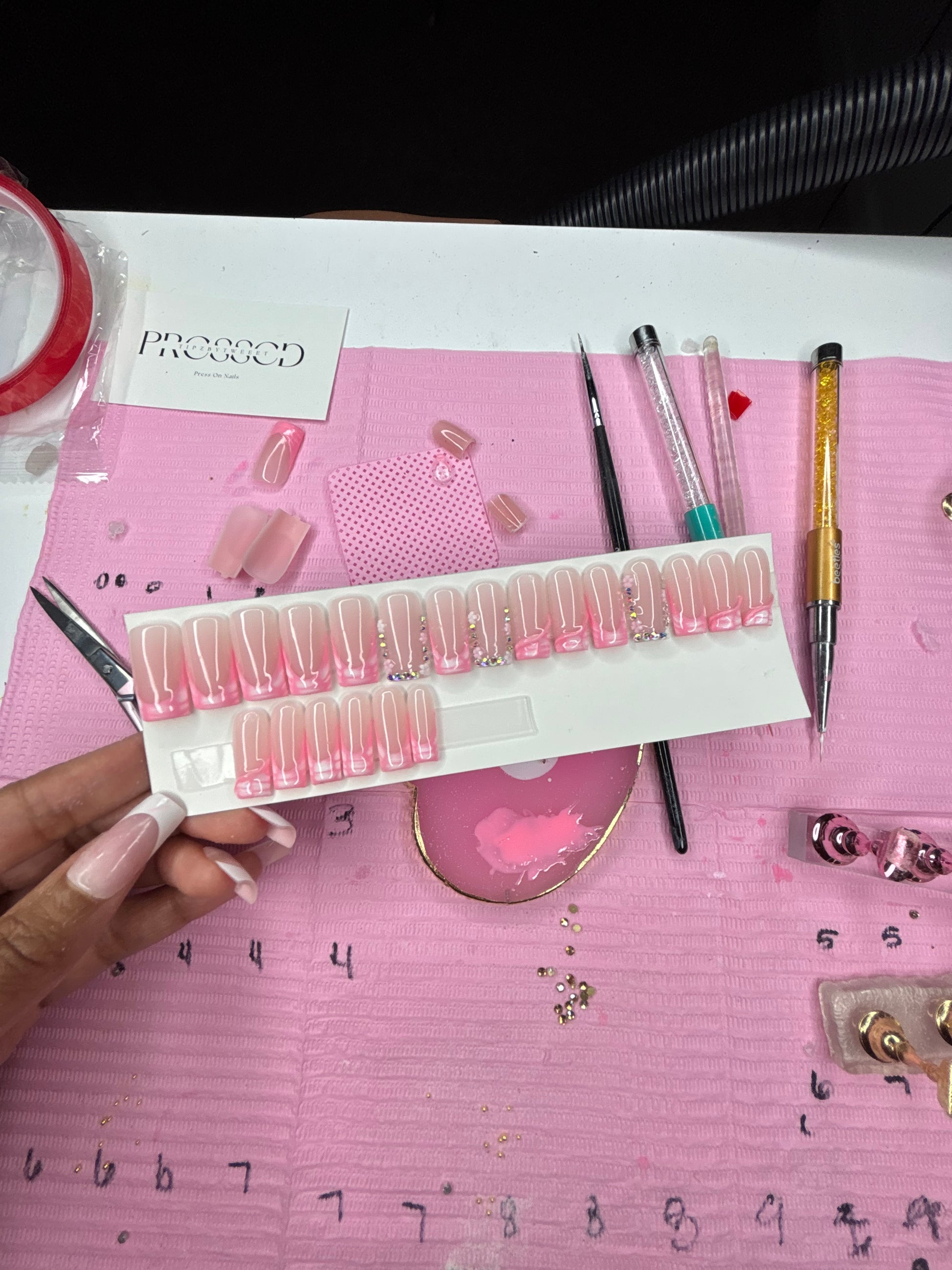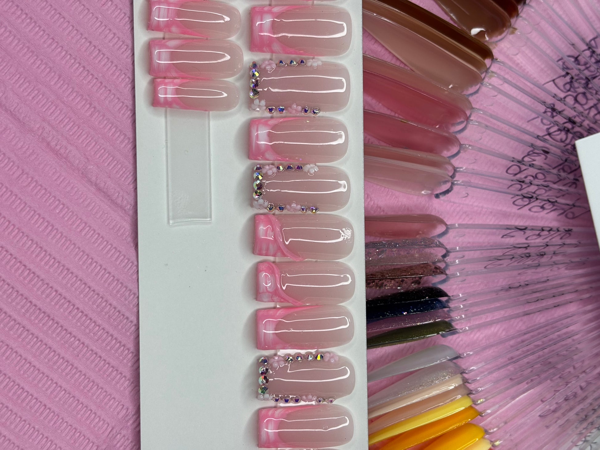 Step into a dreamy vibe with Pink Illusion. This stunning set features soft pink marble French tips paired with sparkling rhinestone accents for the perfect mix of classy and glam. Whether youโre dressing up for a night out or just want everyday luxury at your fingertips, this set makes every look unforgettable.